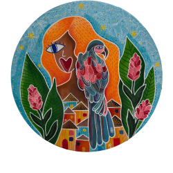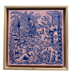 Architectures imaginaires, visages, oiseaux, plantes et soleils rayonnants s ’entrelacent dans des compositions vivantes. Elle jongle entre illustration, peinture et art narratif, créant des œuvres qui invitent à regarder, se perdre et se laisser émouvoir. Sa signature artistique se retrouve dans ses couleurs franches et contrastées, et dans cette capacité à capturer l’énergie des lieux et des gens qu ’elle rencontre.