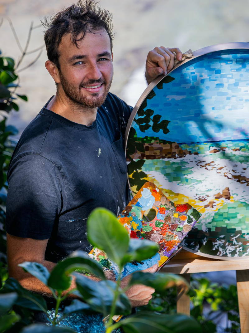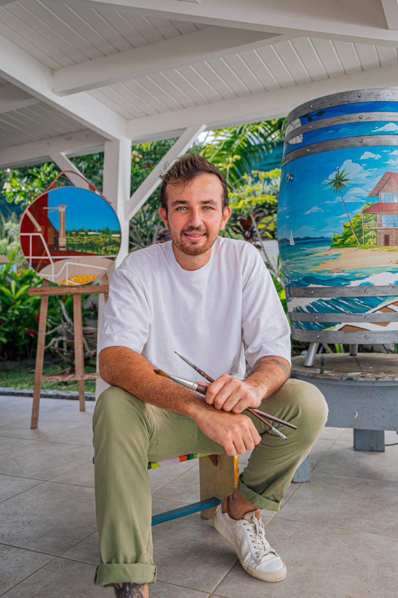 Né à Deshaies, en Guadeloupe, Robin est un artiste qui peint depuis toujours. Dès l’enfance, la création s’impose comme un langage naturel, nourri par les couleurs de son île et par une passion pour l’architecture transmise par son grand-père. Très tôt, il choisit l’art comme voie, guidé par le besoin de donner forme aux émotions et au temps qui passe.