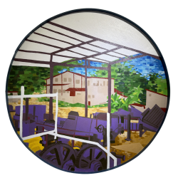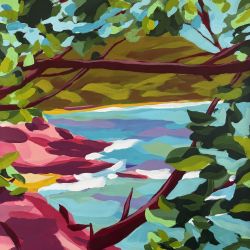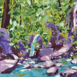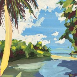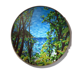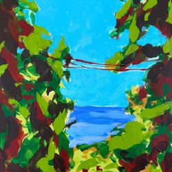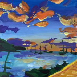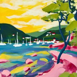 Son univers figuratif se situe entre rêve et réalité. Les paysages qu’il compose jouent avec les contrastes et la couleur, portés par des variations d’ombre et de lumière qui invitent à la contemplation. Les formes sont simplifiées, les lignes affirmées, les aplats dialoguent avec la transparence, structurant des scènes à la fois lisibles et ouvertes à l’interprétation.